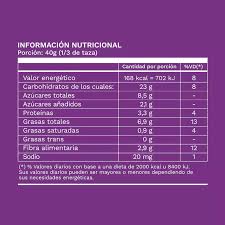 Ingredientes: Avena arrollada gruesa – Pepita de girasol – Pasas de uva – Jarabe de maíz – Copos de maíz – Arándanos deshidratados – Almendras – Nueces.