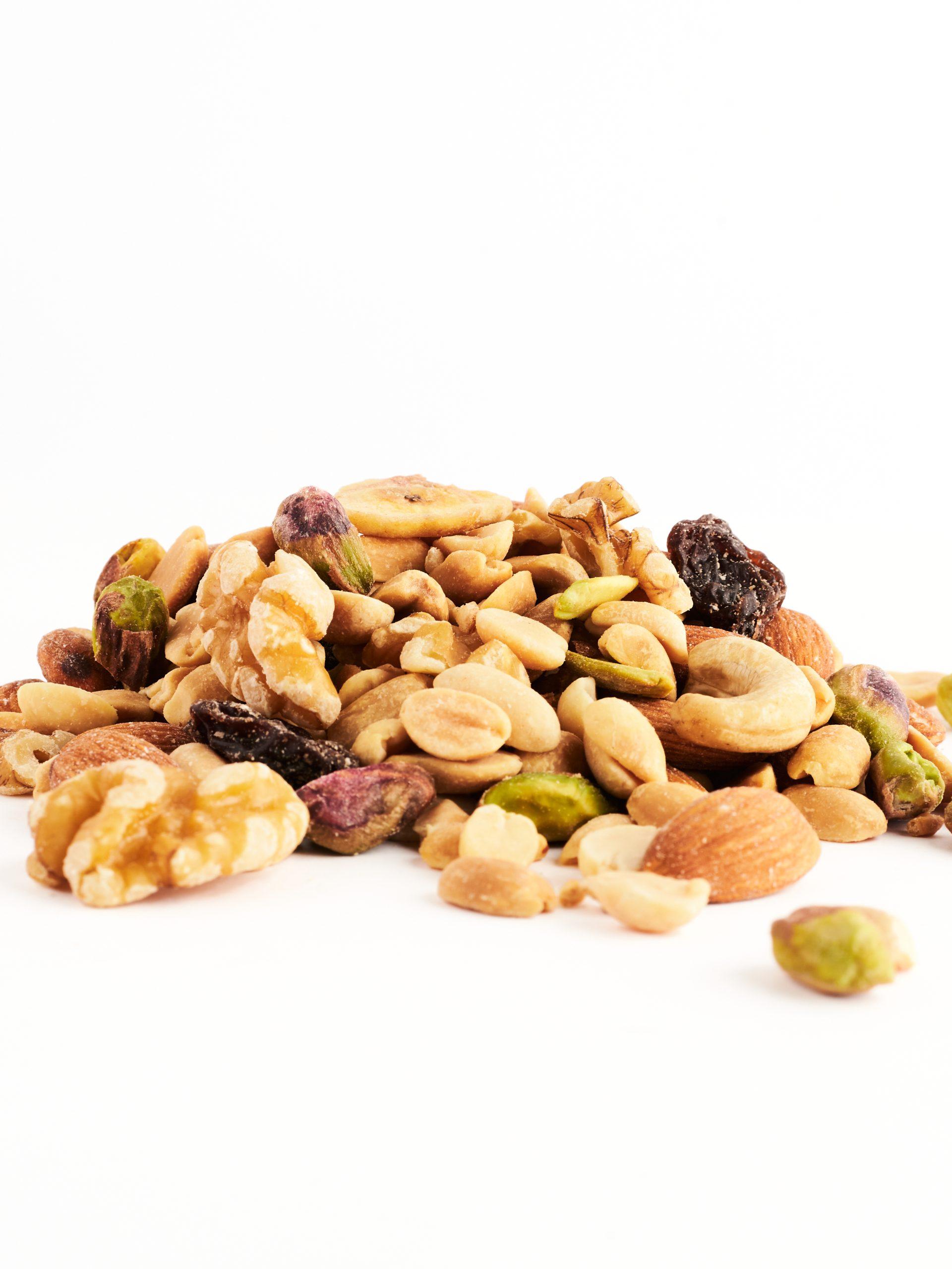 Delicioso mix con maníes, nueces, pistachos pelados, almendras, castañas de cajú, chips de banana y pasas de uva.